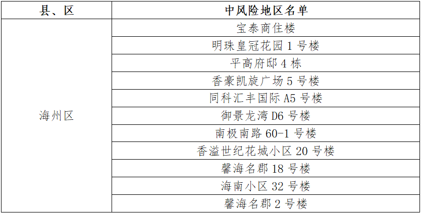 海州區(qū)同科匯豐國(guó)際C10號(hào)樓、紫金公館3號(hào)樓、興業(yè)時(shí)代花園B6號(hào)樓、興業(yè)時(shí)代花園C6號(hào)樓、九龍城市樂(lè)園77號(hào)樓、明珠皇冠花園20號(hào)樓、華潤(rùn)公寓、雙龍村澗西隊(duì)65號(hào)、眾興華庭10號(hào)樓、壹品國(guó)際C區(qū)、香溢世紀(jì)花城小區(qū)2號(hào)樓、明珠皇冠花園11號(hào)樓、小學(xué)路11-1號(hào)樓、兆隆城市洋房A號(hào)樓、振興小區(qū)2號(hào)樓、易居公館4號(hào)樓、浦潤(rùn)花園4號(hào)樓由中風(fēng)險(xiǎn)地區(qū)調(diào)整為低風(fēng)險(xiǎn)地區(qū)。