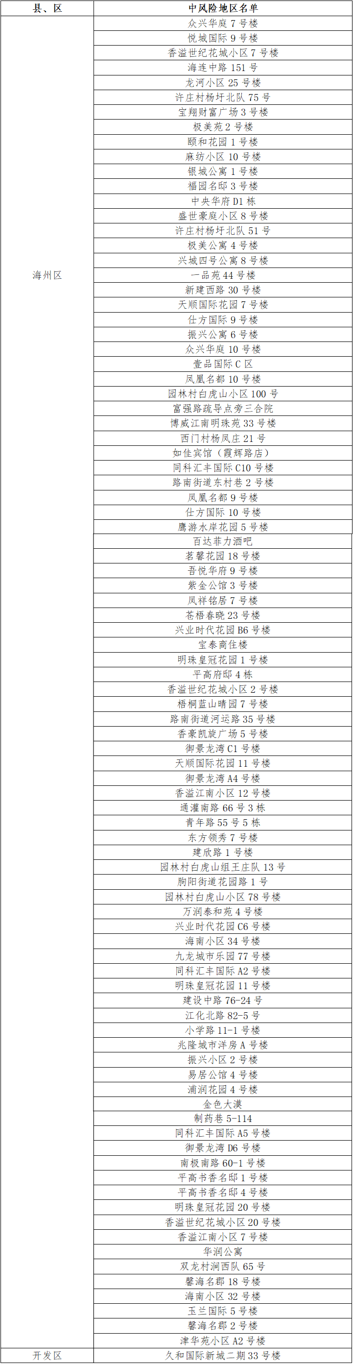根據(jù)國務院聯(lián)防聯(lián)控機制有關規(guī)定,經(jīng)市指揮部研究決定,自發(fā)布之日起,對我市部分區(qū)域疫情風險等級進行調整:海州區(qū)九嶺社區(qū)北大荒西21號由中風險地區(qū)調整為低風險地區(qū)。其他地區(qū)風險等級不變。調整后全市現(xiàn)有91個中風險地區(qū)。 連云港市中風險地區(qū)(91個)