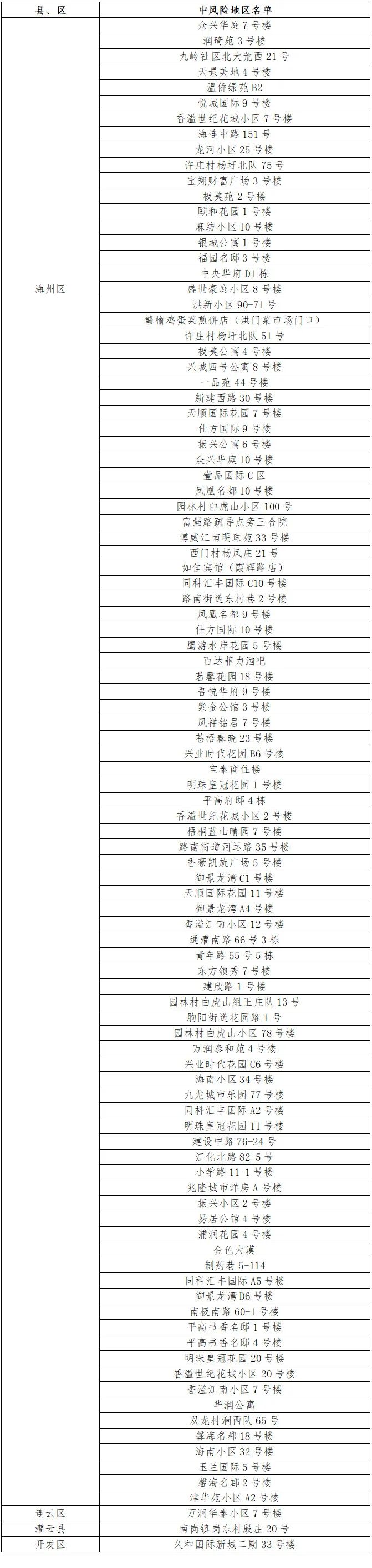 根據國務院聯防聯控機制有關規定,經綜合評估研判,市指揮部決定,自發布之日起,將海州區明珠皇冠花園20號樓、香溢世紀花城小區20號樓、香溢江南小區7號樓、華潤公寓、雙龍村澗西隊65號、馨海名郡18號樓、海南小區32號樓、玉蘭國際5號樓、馨海名郡2號樓、津華苑小區A2號樓調整為中風險地區。