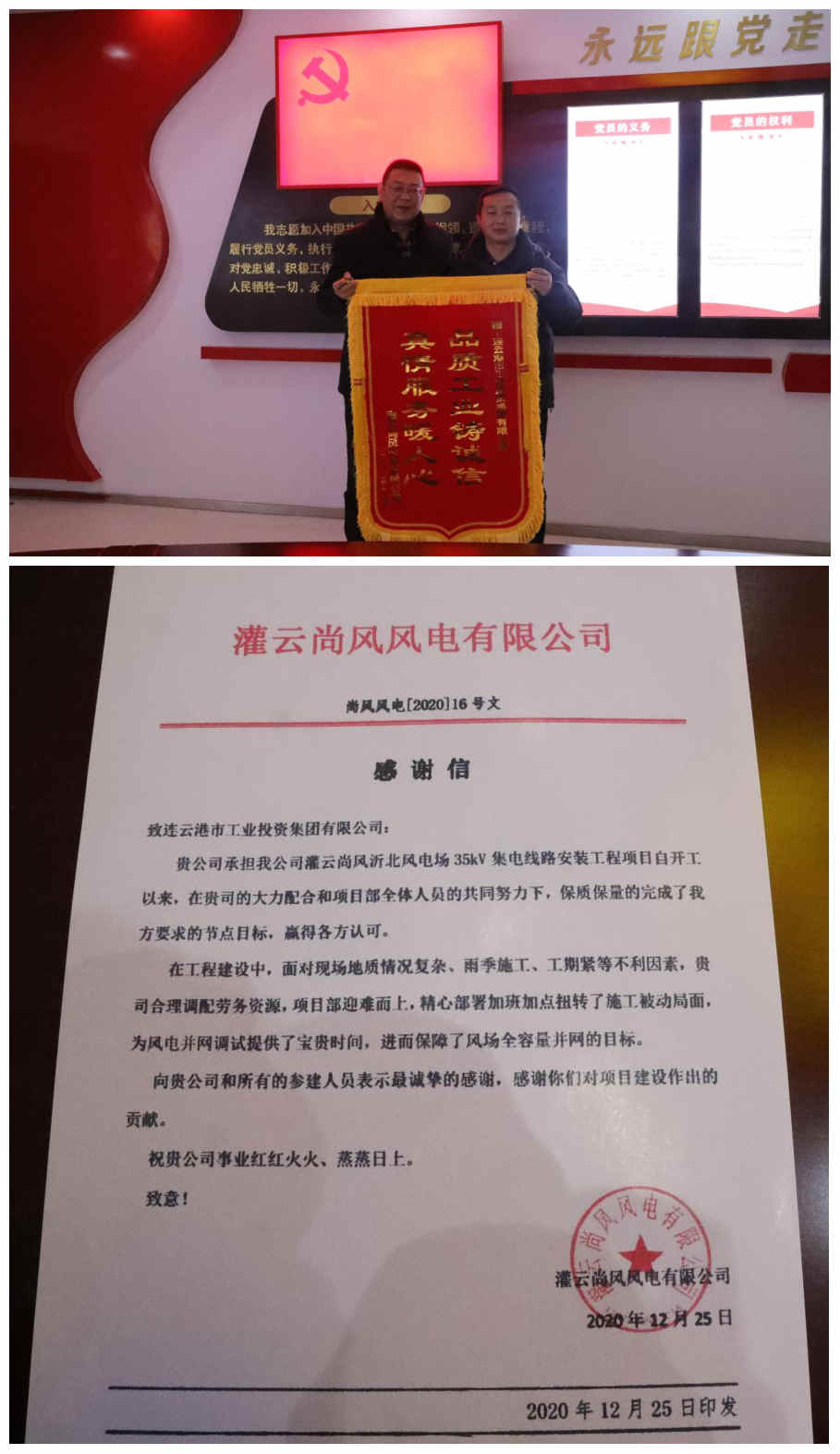1月28日上午,灌云尚風風電有限公司副總經理王現奇一行來到公司,授予我司一面錦旗和一封《感謝信》,以感謝半年來我司在灌云尚風沂北風電場35kV集電線路安裝工程項目中做出的貢獻。
