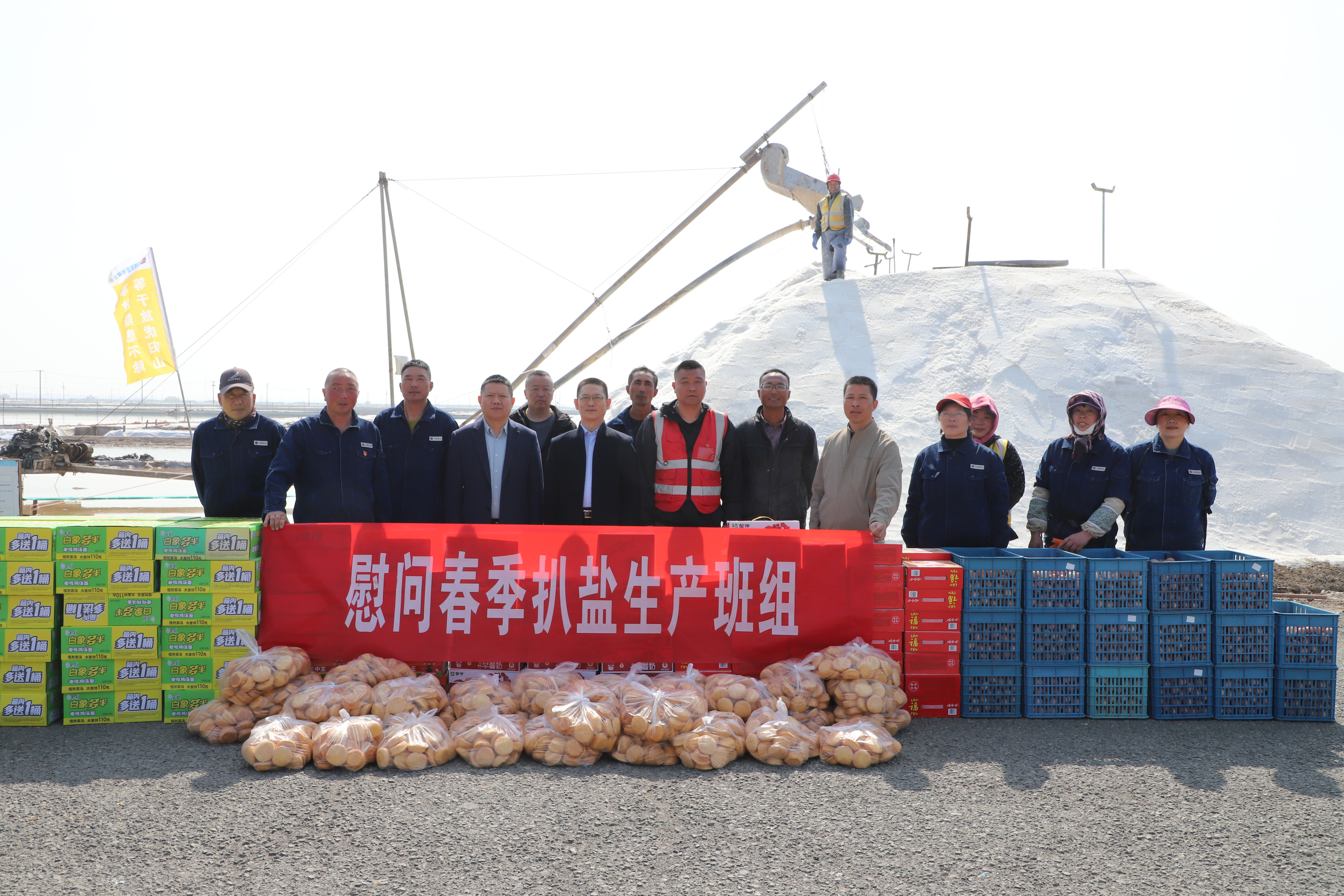 “你們辛苦了,我代表公司來看望大家。”在新河十班與埒南十一班,吳衛平與扒鹽現場職工握手問好,感謝他們在過去的一年為日曬制鹽公司的原鹽生產所付出的辛勤努力,叮囑他們一定要落實落細扒鹽生產措施,增強責任感和警覺性,嚴格執行各項規章制度,切實保障扒鹽期間的安全生產,并送上雞蛋、八寶粥、方便面、牛奶等物品。