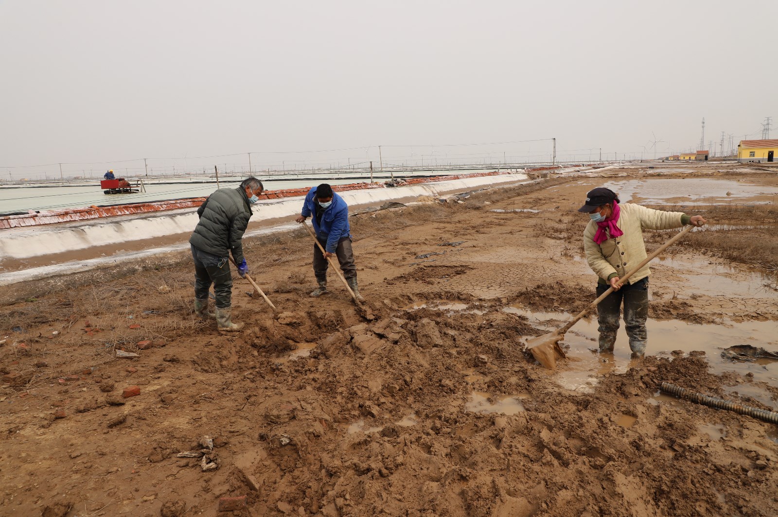 3月28日清晨,在通往日曬制鹽新河、埒南分公司入口處,戴著口罩的工人們依次接受測溫、亮碼、登記,有序進入各生產班組。灘頭上,工人們分散作業,忙著修補塑造、整理廩基……無論是從灘頭到塘頭,還是從碼頭到田頭,處處都呈現出熱火朝天、大干快上的場景。