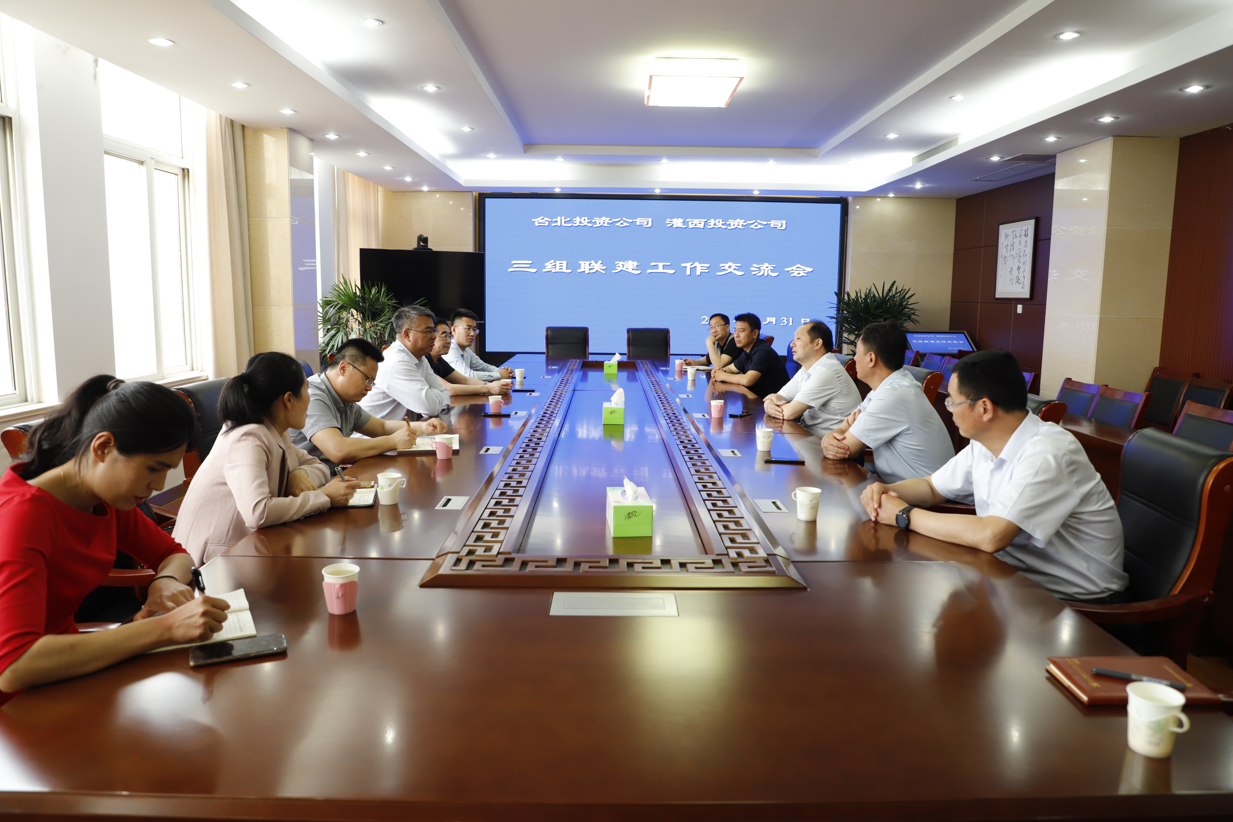 5月31日,臺北投資公司黨委書記、董事長、總經理王德志帶領三組聯建調研組來到灌西投資公司參觀交流。灌西投資公司黨委書記、董事長、總經理李國文、常務副總經理吳衛平、黨委副書記、工會主席王宏陪同參觀、座談。