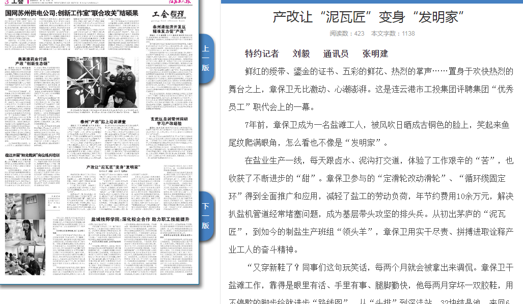 近年來,連云港市工投集團灌西公司為打通產(chǎn)業(yè)工人成長成才的身份壁壘、價值體現(xiàn)壁壘及學習教育壁壘,開辦技能培訓“大課堂”,打造“一中心+三基地”職業(yè)教育平臺,即金藍領技術(shù)工人培訓中心和技能比武基地、技術(shù)創(chuàng)新基地、技能鑒定基地,構(gòu)建公司、單位和班組三級職業(yè)教育體系、技能培訓體系和技能評定體系,引導產(chǎn)業(yè)工人重在技能深耕、求精、拔尖、攀高上磨練塑造。章保衛(wèi)正是在技能培訓的“大課堂”中一步一步成長起來,他參與的“定時打鹵泵”、“管道輸送加壓法”、“低溫除硫工藝”等技術(shù)得到快速推廣,也讓他從普通員工成長為“二星級優(yōu)秀員工”,被推選擔任制鹽生產(chǎn)班組長,每月工資增長800元。這一切讓他獲得滿滿的榮譽感和幸福感。