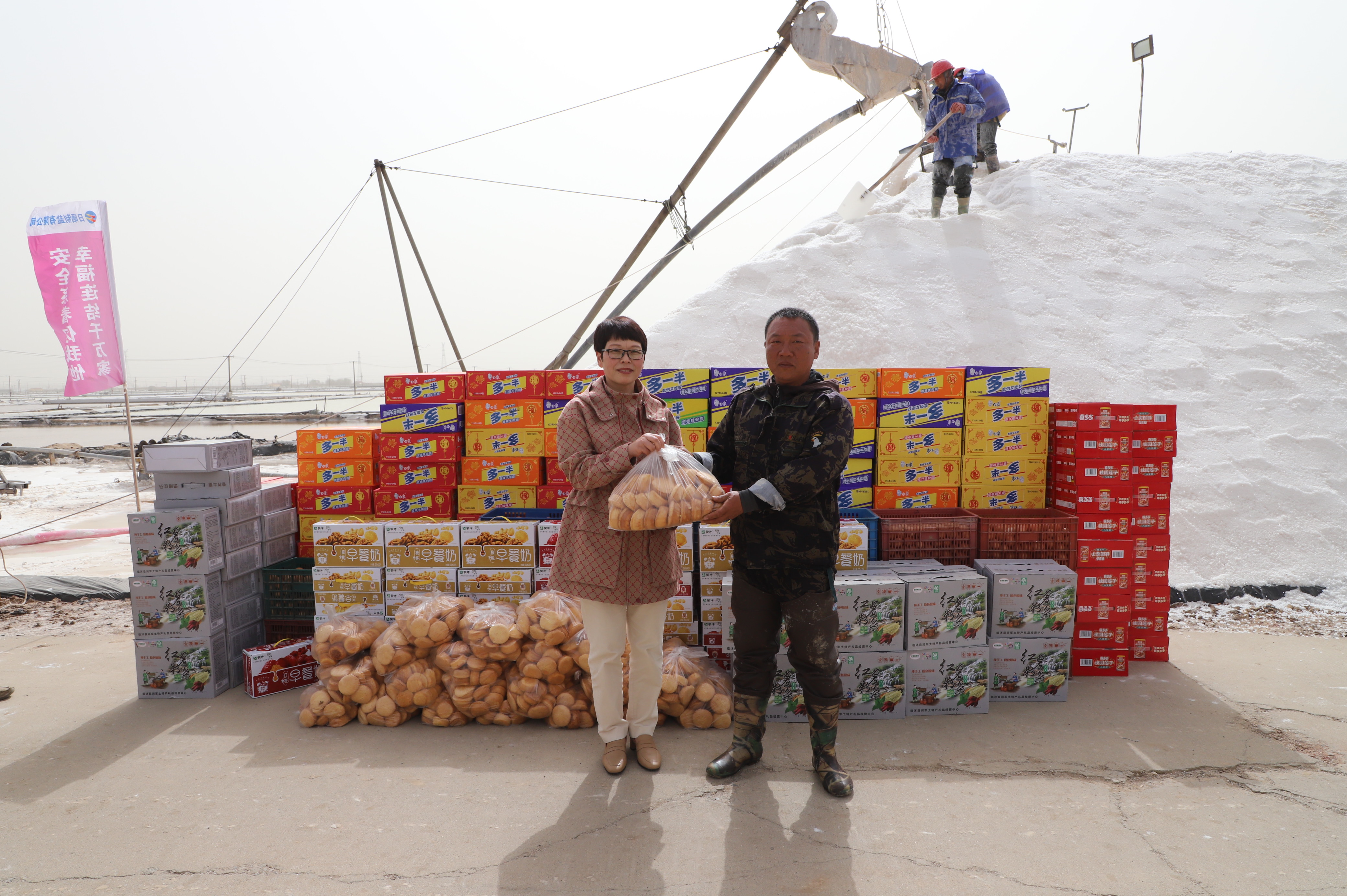 “你們辛苦了,我代表公司來看望大家。”在新河九班與埒南九班,王宏與扒鹽現場職工握手問好,感謝他們在過去的一年為日曬制鹽公司的原鹽生產所付出的辛勤努力,叮囑他們一定要落實落細扒鹽生產措施,增強責任感和警覺性,嚴格執行各項規章制度,切實保障扒鹽期間的安全生產,并送上雞蛋、八寶粥、方便面、牛奶等物品。