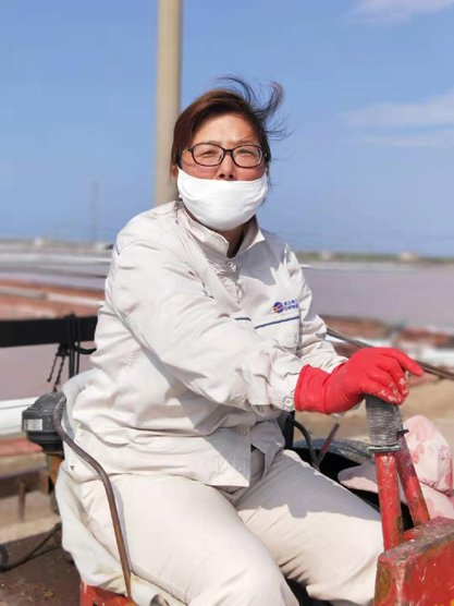 每一個女孩都喜歡美麗的衣服,都喜歡把自己裝扮得漂亮迷人??墒枪ぷ鞯奶厥庑圆辉试S鹽灘工“貌美如花”。周娟,37歲,新河制鹽分公司5班一名普通的女工,她關注班組集體事務,能夠團結、關心班組女工,并積極帶領女職工昂揚向上,奮發有為,為單位鹽業生產多作貢獻。周娟特別注重對新上崗的員工培訓教育工作,她總是不厭其煩講解原鹽操作流程及工作中的注意事項和安全隱患,毫不保留將自己多年的經驗傳授給大家。炎熱的夏天,當大家坐在辦公室,吹著空調、喝著冰水時,她和她的同事依舊在鹽灘忙碌著,嬌嫩的皮膚被曬得黝黑。盡管如此,她依然每天駕駛著活茬機,一遍又一遍地游走在鹽田,將汗水撒在工投。