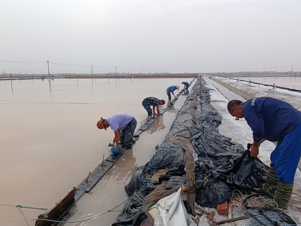 隨著主汛期到來,由于各班組部分塑布已達使用年限,老化嚴重,且容易造成鹵水跑漏現象發生,為了減少鹵水損耗,7月10日,新河制鹽分公司黨支部組織黨員突擊隊到班組對到期塑布進行更換