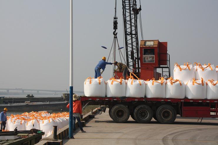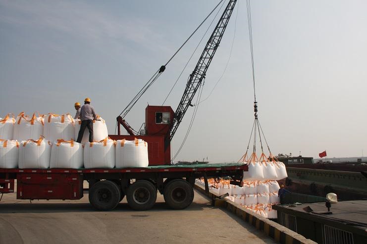 4月30日上午9時許,隨著一聲汽車長笛,一輛載有近40噸化工物資的卡車徐徐停靠在宵洋物流公司五灌河碼頭邊,緊接著碼頭鐵臂起舞,機械操作工嫻熟地操縱著塔吊機械,準確地將一包包噸貸物資裝卸在碼頭邊的貨船中。。。。。。自此,一輛輛滿載40余噸貨物的卡車源源不斷向碼頭駛來。