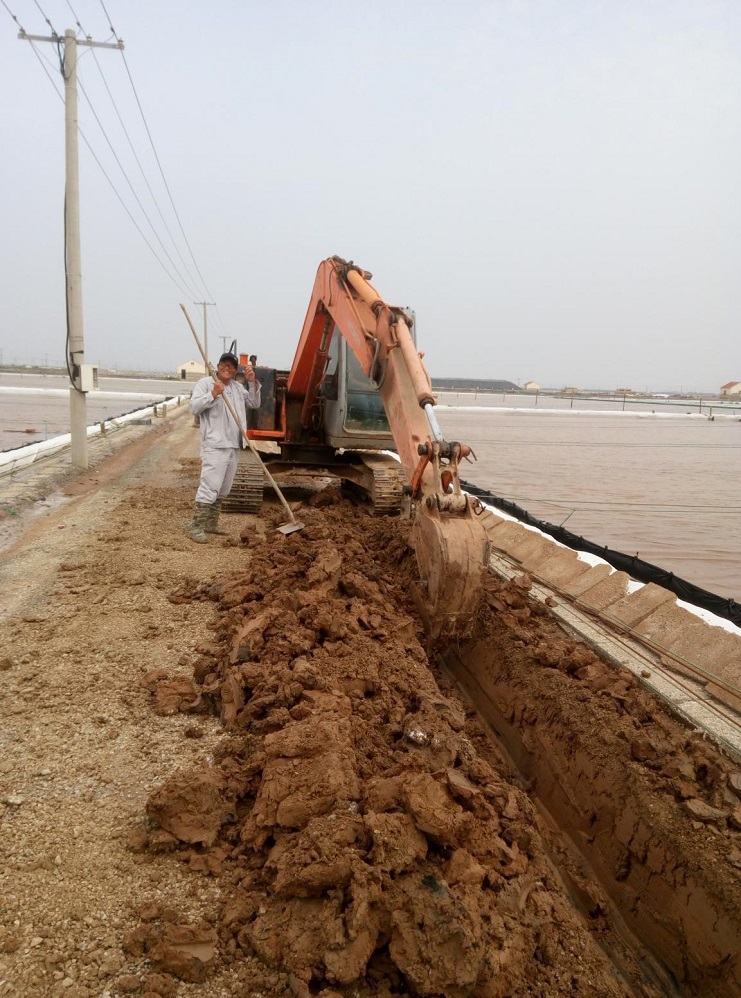 埒南制鹽分公司8班,伴隨著挖掘機(jī)的轟鳴,日曬制鹽公司生產(chǎn)班組“天溝工程”正式進(jìn)入施工試驗階段。天溝是海鹽生產(chǎn)的配套設(shè)施,在結(jié)晶區(qū)利用天溝加鹵能有效的減少鹵水的混雜,實(shí)行分質(zhì)分段結(jié)晶,是提高原鹽質(zhì)量的重要手段。日曬制鹽公司經(jīng)過反復(fù)調(diào)研論證,用傳統(tǒng)海鹽生產(chǎn)工藝架接礦鹵生產(chǎn),在生產(chǎn)班組架設(shè)天溝,實(shí)施串聯(lián)、并聯(lián)加鹵相結(jié)合,給鹵水的調(diào)配、除硫、除混帶來便利,實(shí)現(xiàn)分質(zhì)分段結(jié)晶,為原鹽質(zhì)量的提高寫下了重重的一筆,同時天溝加鹵可以減少班組流動機(jī)泵的使用頻率,提高了班組整體安全生產(chǎn)系數(shù)。