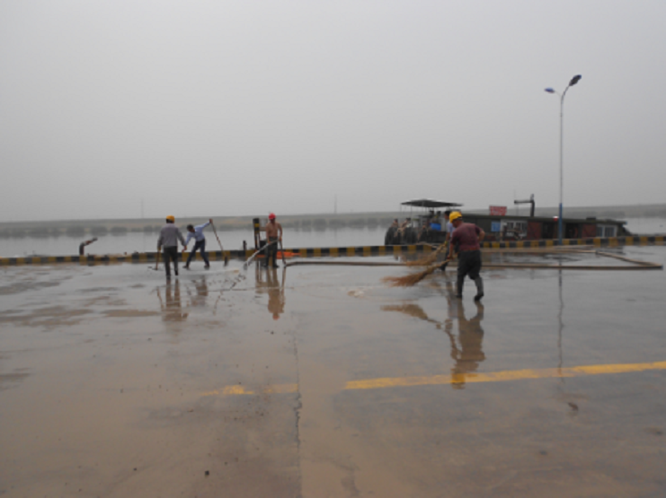 近期由于五灌河水位下降,給??看a頭的船只帶來了很大的安全隱患,于是公司決定對碼頭岸線的河道進行一次清淤工作,在清淤的運輸過程中使碼頭作業區一片狼跡,為了不影響宏港石化的PPA噸袋的吊裝業務,6月11日上午公司班子成員主動放棄休息日與上班工人一道對碼頭作業區進行清理,他們有的用水槍沖,有的用掃帚掃,經過二個多小時的奮戰,作業區場地上渙然一新。(宵洋葛高平)