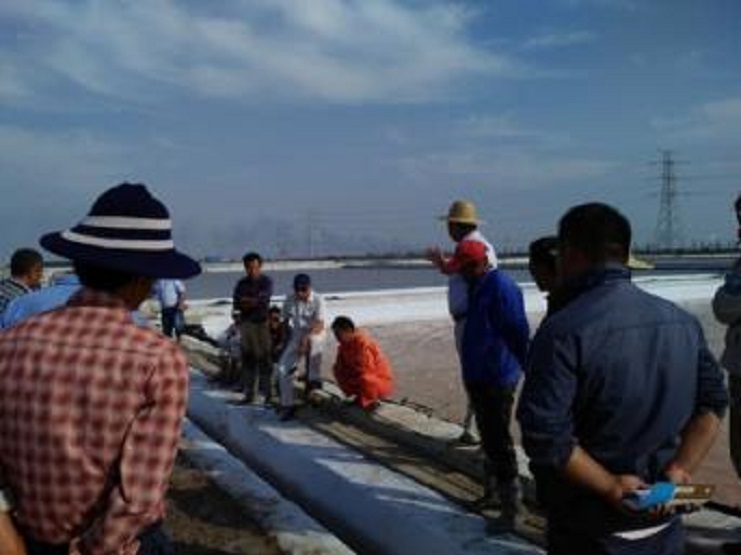 該分公司一班人帶著十六名班長,到新河零班做加鹵“天溝”工作現場。剛到目的地,站在打好的溝頭,一眼望去,二條溝口線筆直,和熟捯實的粘埝泥輕而易舉承載著人的重量。此條加鹵“天溝”嚴格按日曬制鹽公司規格標準而建,溝長約210米,上口寬55cm,下口寬30cm,溝深45cm,溝底坡勢順沿三排到頭排由淺至深。做好的一條加鹵溝, 可以為六塊結晶池扒鹽期間分別添加鹵水,減少洗鹽鹵水進其它池塊的二次污染。
