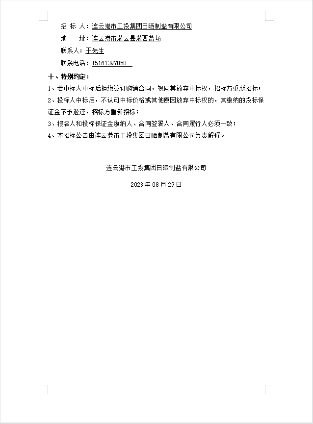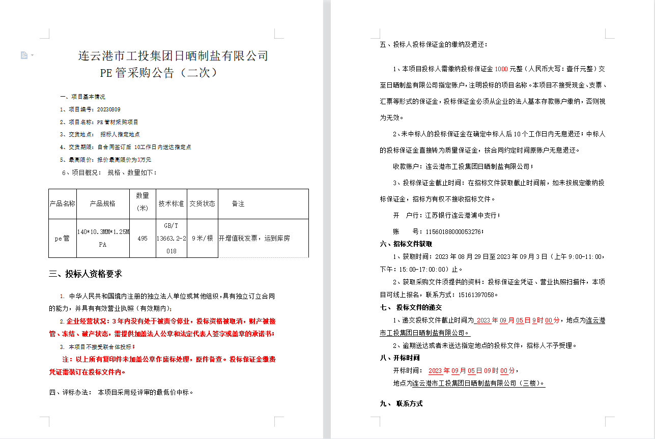 連云港市工投集團(tuán)日曬制鹽有限公司PE管采購(gòu)公告(二次)