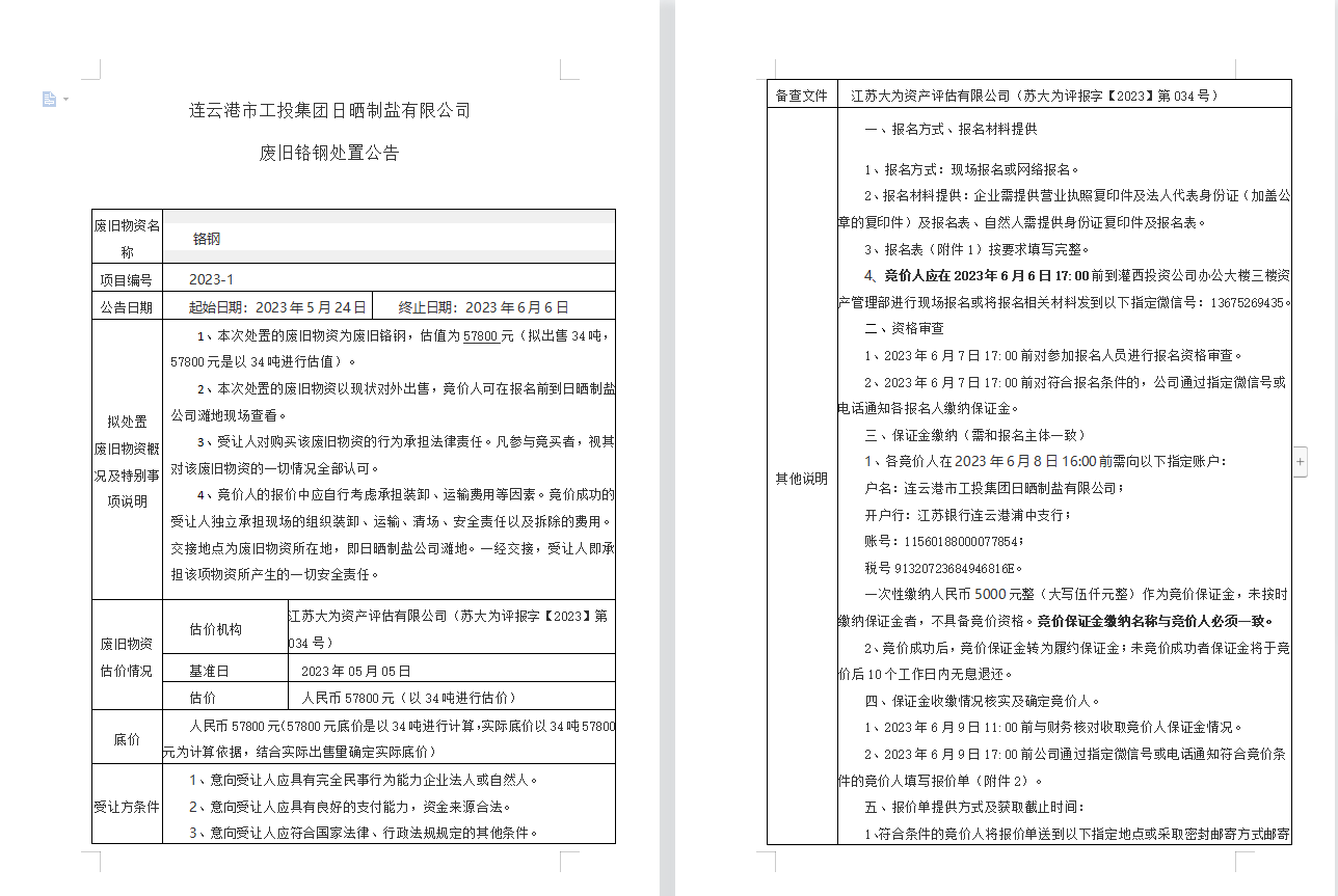 連云港市工投集團(tuán)日曬制鹽有限公司廢舊鉻鋼處置公告
