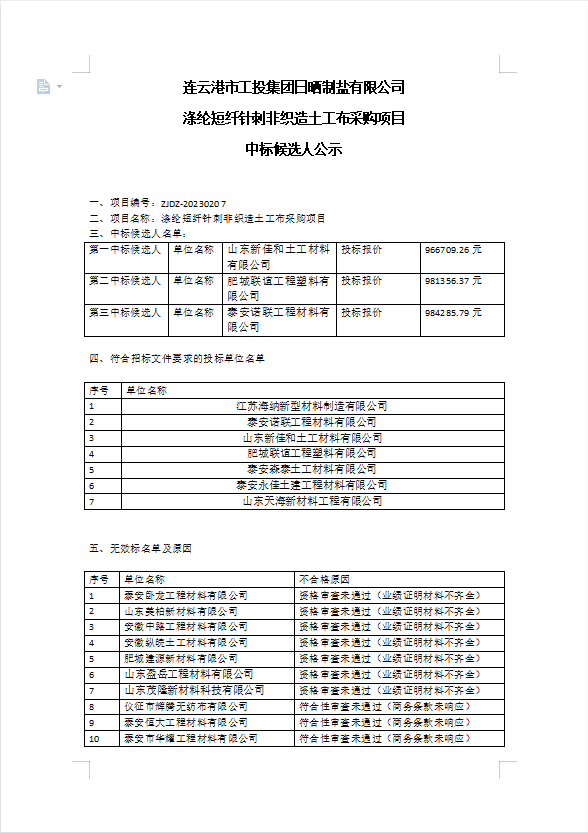 連云港市工投集團(tuán)日曬制鹽有限公司滌綸短纖針刺非織造土工布采購(gòu)項(xiàng)目中標(biāo)候選人公示