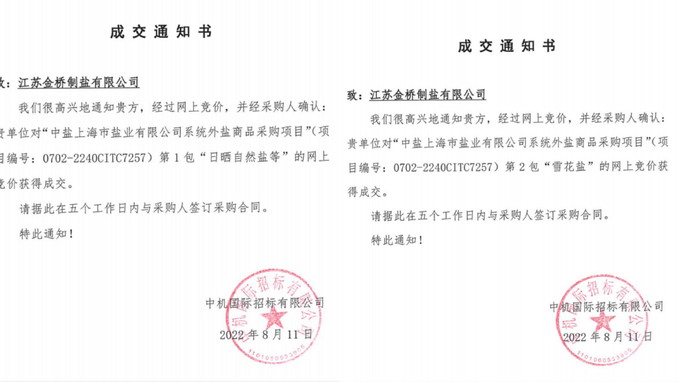 近日,我公司以網上競價的方式,成功中標中鹽上海市鹽業有限公司系統外鹽商品2022-2023年度采購項目,標的量1.5萬余噸。