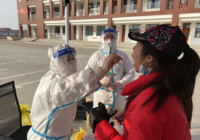 圖為黨員霍晶協(xié)助醫(yī)務(wù)人員對居民進行核酸采樣