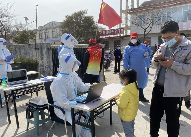 圖為黨員張根玲正在核酸檢測信息登記