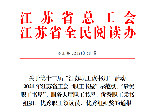 近日,江蘇省總工會、江蘇省全民閱讀辦聯合下發《關于第十二屆“江蘇職工讀書月”活動通報》(蘇工辦【2021】58號)文中,我公司職工書屋獲評2021年度江蘇省工會“職工書屋”示范點,同時獲贈圖書近200冊。
