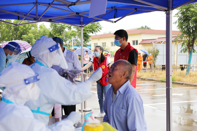 “黨旗飄在一線、堡壘筑在一線、黨員沖在一線”。核酸檢測現場,來自青口公司黨員志愿者在現場為職工群眾提供相關咨詢和掃碼指導服務,很多黨員在核檢工作中全身濕透仍在雨中盡力維護秩序,盡管天氣不作美,但是職工群眾依然按工作人員的指導有序地進行核酸檢測。大雨里,黨員紅、醫護白顯得格外耀眼。(仲偉彬)
