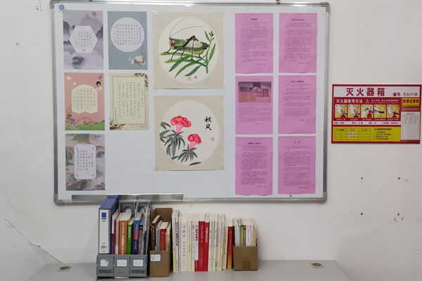 走進我們的物檢室,這是熟悉的不能再熟悉的地方,一進門,一個小小的變化就驚訝到我了,眼前一亮。原來在我的強力機前面的墻上掛著一個白板,白板上貼著我們部門員工的各種作品,分為三塊,左邊是五張唐詩書法,右邊是公司網站登出的六篇文章,中間則是我們部門才女張云的兩幅畫,特別是橘紅色那一抹,使得整個版面亮起來了。真不知道我們的才女怎么那么有才的?
