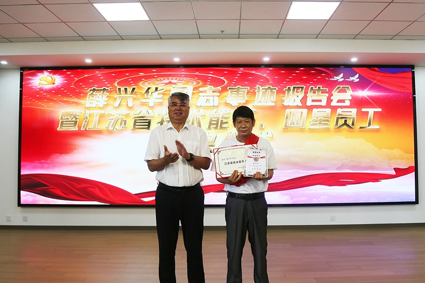 報(bào)告會(huì)上,公司總經(jīng)理卞霄宣讀了《關(guān)于增評(píng)薛興華同志為“四星級(jí)員工”的決定》和在全公司范圍內(nèi)開展“向江蘇省技術(shù)能手薛興華同志學(xué)習(xí)”的活動(dòng)通知。公司黨委書記、董事長王德志為薛興華同志進(jìn)行了現(xiàn)場授牌頒獎(jiǎng)。