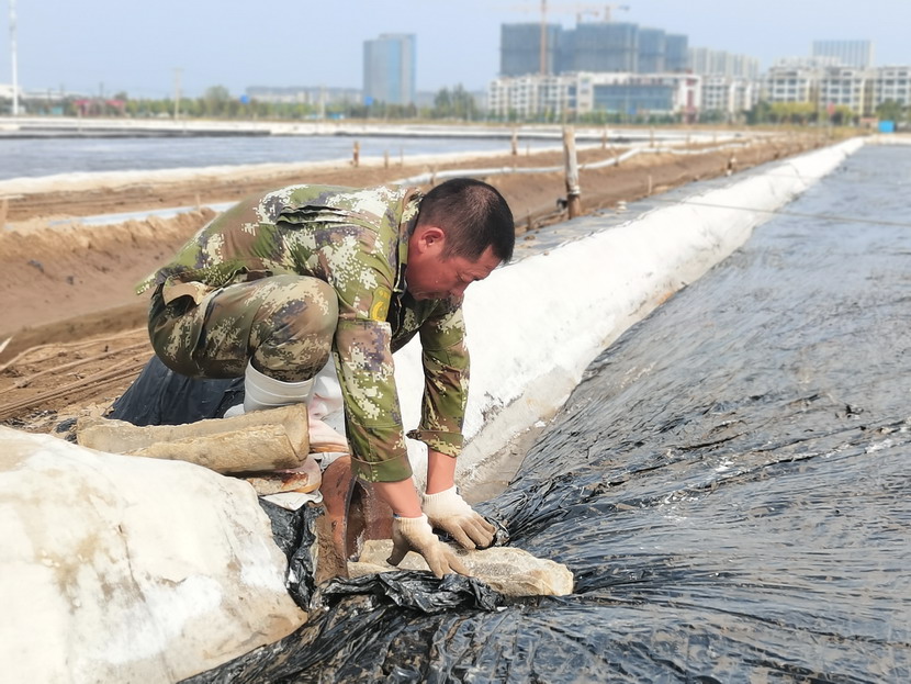 礦鹽班組根據天氣狀況做好雨前塑布苫蓋工作,確保勞動成果不受暴雨影響,最大化實現年產量,并利用扒鹽停機間隙做好灘地基礎工作,維護輸鹽管道及集鹽機,以便于扒鹽開機高效率運轉。