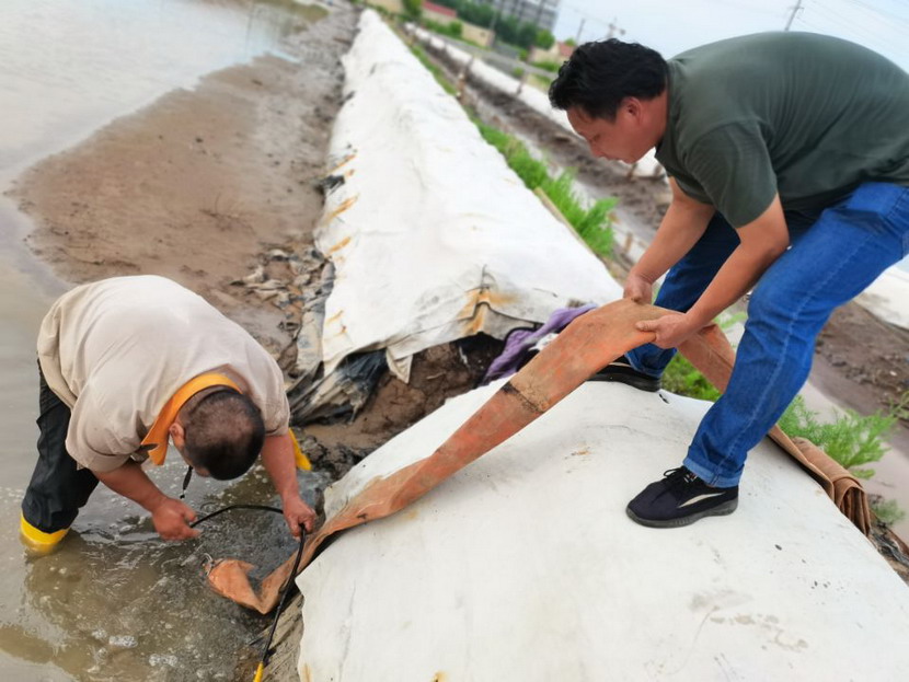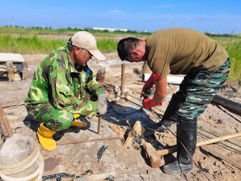 來到海州灣公司灘頭,遠遠望見幾名職工在鹽池里勞作,走近一看,組長夏軍正帶領一組人整修塑苫池。“我們5點就出來了,趁早涼,趕緊把塑料布整理一下,布子上都是鹵,長了鹽就不好處理了,搞不好這鹵水還會淌到外面去,造成浪費......”邊說著邊用肩膀頭子蹭一下眼角的汗水,手里的活一直沒停。據了解,海州灣公司承接臺北礦鹽和鈣液兩大產業,經濟比重占全公司收入60-70%,當前雖然是高溫期,但是廣大職工搶抓汛期難得的晴好天時,每天清晨5點就在灘地上忙碌起來,汗水模糊了雙眼,額頭的汗水順著帽檐往下滴落,身上的衣服一直都是濕漉漉的,緊貼在身上,即便如此,他們也毫不在意,用他們的話:“看著池子里每時每刻都在落鹽,這點汗就沒白淌啊!”我們臨走的時候,夏軍還不忘“今年我們保證鹽量突破2萬噸,不虧損。”