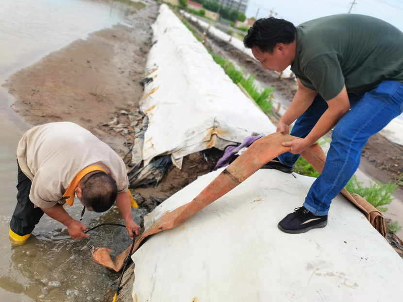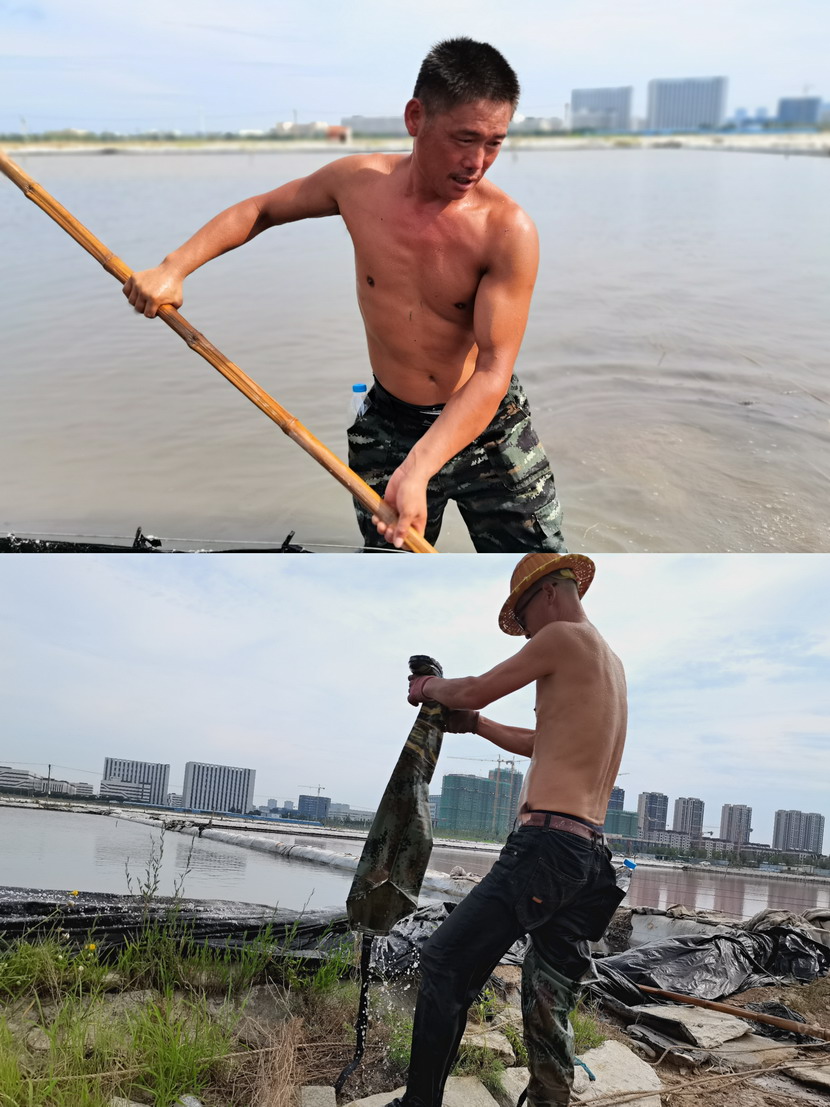先鋒泵站,程輝師傅撩起工作服擦了擦臉上的汗水,繼續將潛水泵安置到已廢棄的灘地里,把灘地里的雨水抽干,將廢棄的灘地利用起來晾曬低濃度的鈣液,解決銷售旺季成品鈣液供不應求難題。