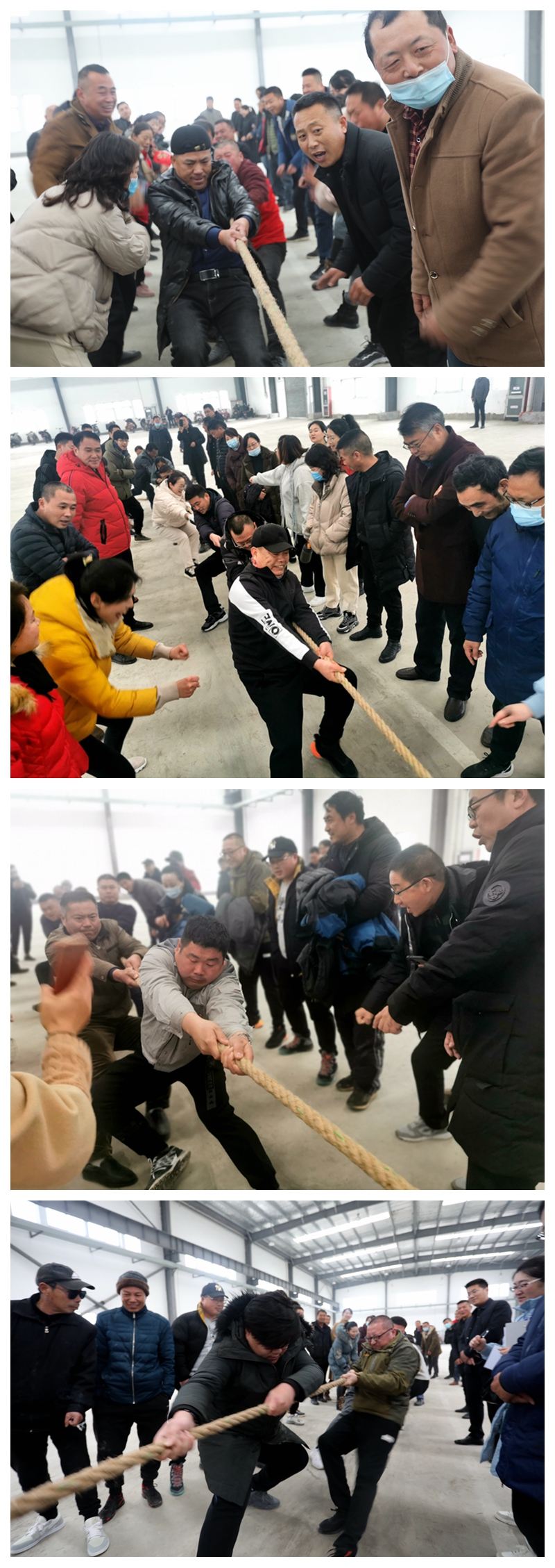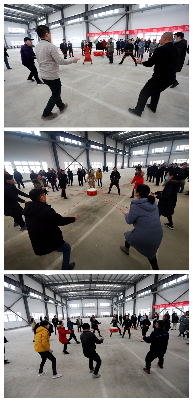 陽(yáng)光熹微,冬日似金。為喜迎2021年新年的到來(lái),大力弘揚(yáng)團(tuán)結(jié)拼搏,昂揚(yáng)向上、奮發(fā)有為的精神風(fēng)貌,營(yíng)造生動(dòng)活潑、寬松和諧、積極健康的良好氛圍,1228日下午,投資公司在海州灣公司9號(hào)廠房舉辦“慶豐收、展風(fēng)采、譜新篇”迎元旦職工趣味運(yùn)動(dòng)會(huì)。本次趣味運(yùn)動(dòng)會(huì)分為拔河、同心擊鼓、企鵝漫步、快樂(lè)點(diǎn)球等四個(gè)項(xiàng)目,分為兩天舉行,本日舉行拔河、同心擊鼓兩項(xiàng)比賽。