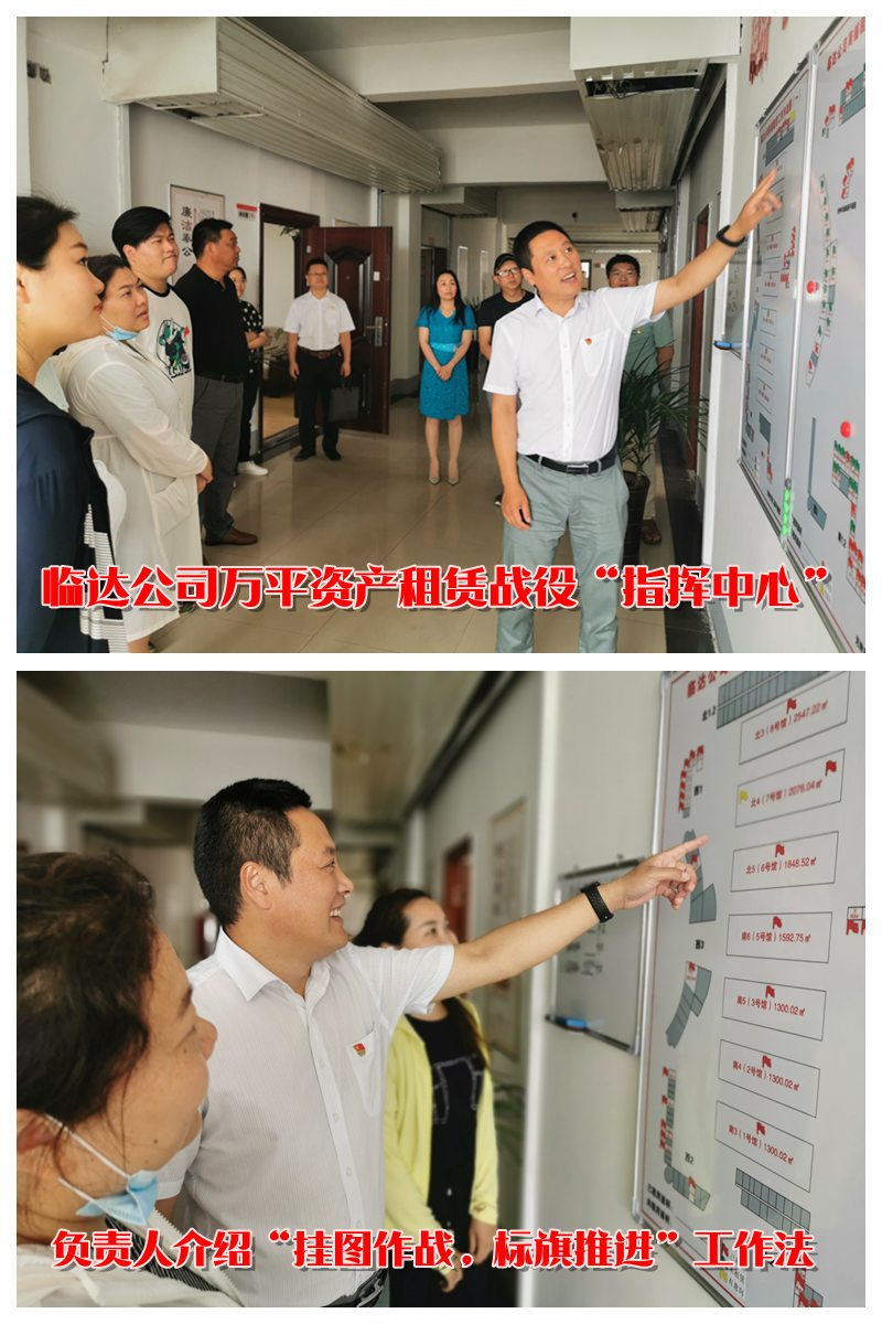 “分解任務,每天出租180平方,我們用掛圖作戰工作方法,在困難中找優勢,在優勢中找方法,將集中資產劃分片區,分而治之,實行一個片區一個目標導向,一個片區一個工作方法”“臨鋒而行,達道致遠,這是臨達公司的立企宗旨,我們是這么喊,也是這么干的”“臨達的年輕同志們是我們能夠突破7200平方任務的秘密武器,他們上門商談至天黑,周六周日讓他們休息都不休息,依然堅守崗位跑市場”在臨達公司的“作戰指揮中心”,聽取負責人杜洪波的介紹后,參加采風的同志都忍不住豎起大拇指為先拔頭籌,超額超時完成任務的臨達全體“指戰員”點了個贊。