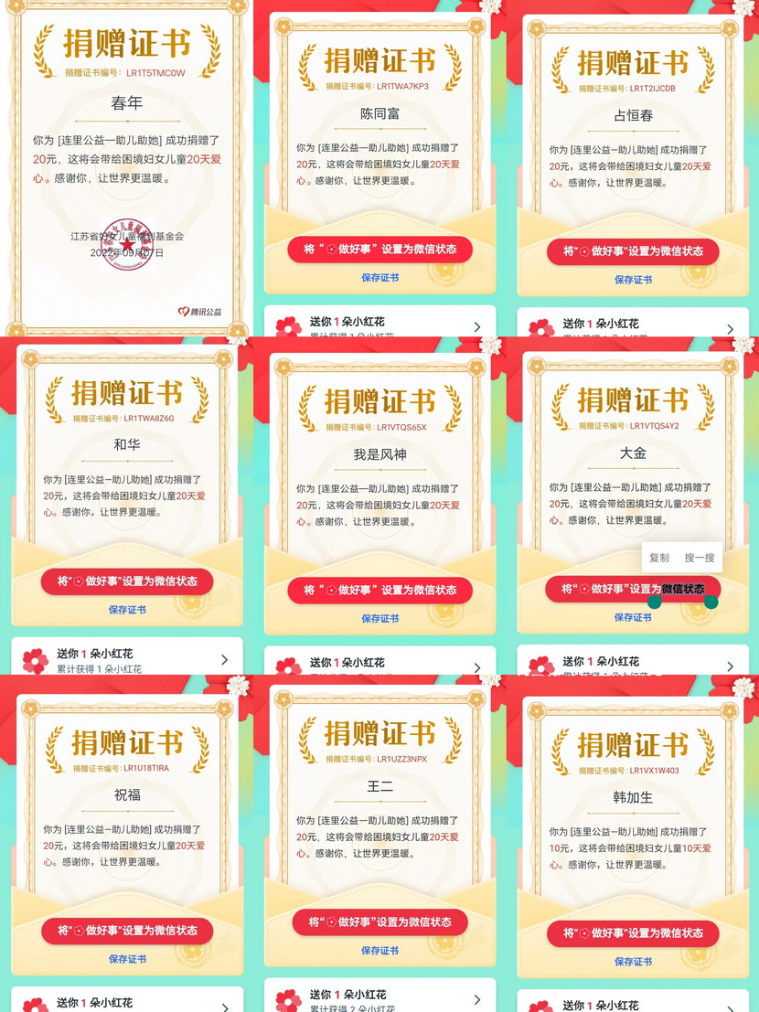 99公益日”是響應國家95日中華慈善日號召,由騰訊公司聯合數百家具有公開募集資質的慈善組織共同發起的全民公益活動。近年來,在海州灣公司,傳播社會正能量、弘揚社會正氣的良好氛圍日益濃厚,涌現出撿數千元現金歸還失主的朱文健、幫扶救助中暑暈倒老人的王緒峰、免費理發多面手霍正鋼等等數名愛心職工。在99公益日”募捐活動中,雖然公益平臺最低募捐金額1元即可,但是廣大職工盡力奉獻自己的一份力量,1020元比比皆是,氣氛十分熱烈。大家紛紛表示,奉獻愛心、扶貧濟困是每個社會公民應盡的責任和義務,只要人人都獻出一點“愛”,就能形成“滴水成河、匯流成海”的磅礴力量
