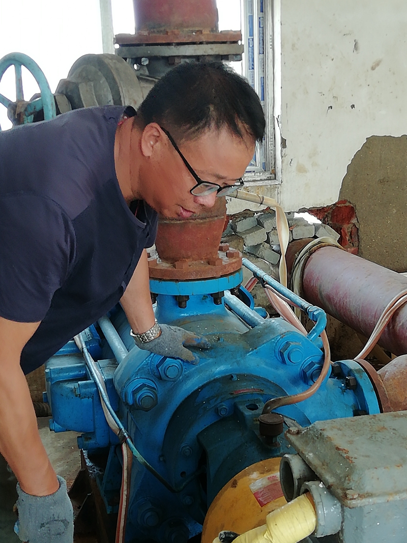 在徐圩運鹽河畔,玻璃鋼管道維修現場,發電機隆隆轟鳴聲中不時夾雜著角磨機刺耳的打磨音,所到之處風塵飄揚。白色塵霧中,一名五十多歲的中年漢子正凝神專注的低頭操作,仔細的打磨著玻璃鋼管道接頭的每一片角落,絲毫不敢馬虎。不時,他摘下眼鏡取下戴在嘴上的防護口罩,鼓起腮幫用力吹去眼鏡上飄落的粉塵。顧不得擦一把額頭上的汗水,戴好眼鏡和口罩,調整好位置繼續俯下身打磨,他就是翔立分公司顧圩泵站班組長顧昌全。