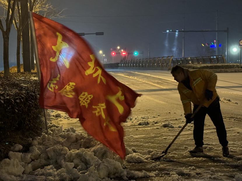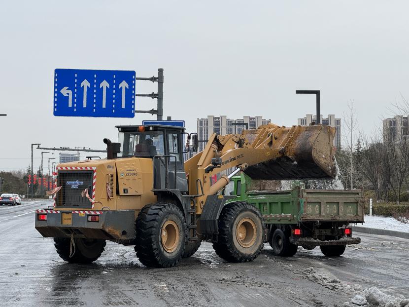 本次掃雪除冰共配備了3輛清掃車、2輛鏟車、1輛撒布機以及20余噸融雪劑,20余把推雪鏟、鐵鍬等清雪工具,采取“邊下邊除、邊除邊清、邊清邊運”的方式,根據道路積雪厚度和結冰情況,通過撒布融雪劑、除雪鏟推雪、人工配合等多措并舉,有效清理區內主干道積雪,做到“即下即掃、雪停路清”,保障群眾出行安全。此外,針對紅綠燈路口、馬路轉彎處、陡坡、橋面以及非機動車道等重要節點,環衛分公司又出動了100余名工作人員點對點人工撒布融雪劑,共保障面積300余萬平方米。