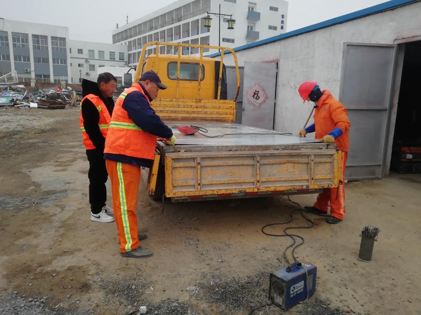1月9日上午,經過該公司設備維修班組再三斟酌,考慮如送修理廠維修,不但產生一筆不小的維修費用,而且等待維修過程時間較長,影響工作進度,為能給公司節省開支和不影響工作進度,維修人員量好車廂底板尺寸后,將鐵板切割出需要的尺寸,一塊塊拼湊起來,加固在車廂底板上,通過半天的時間,順利為工具車底板披上一層合身、漂亮又特別的“盔甲”,有效延續了它的使用壽命。