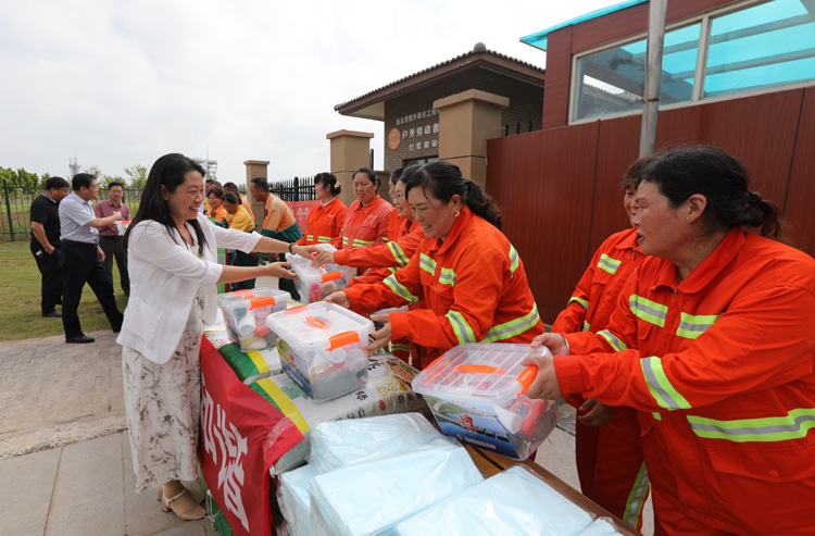 ????? 84日上午,市總工會副主席王悅到連云港綠化工程公司基層班組開展“送安全、送清涼、送法律”活動,走訪慰問堅守在高溫作業現場的市政養護職工,在送去防暑藥品、涼茶、礦泉水、綠豆、白糖、毛巾等防暑降溫物品的同時,為他們送去絲絲涼意誠摯的關懷。